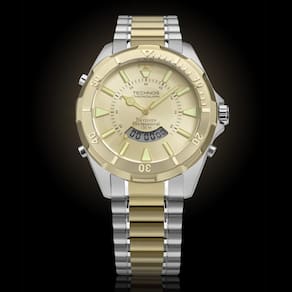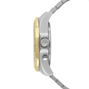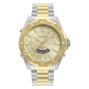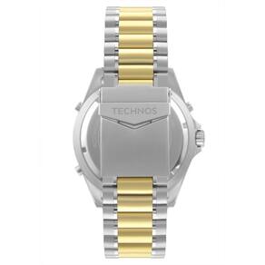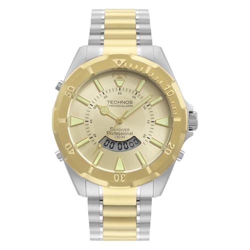 descrição: relógio technos skydiver com caixa e pulseira de aço inoxidável em banho bicolor dourado/prateado. O modelo icônico da marca apresenta um maquinismo digiana exclusivo, aro giratório na cor dourada e, no mostrador, detalhes em dourado com lumi. Possui tamanho de caixa 48mm e resistência à água de até 15 atm. Acompanha: - manual de instruções - embalagem - certificado de garantia -