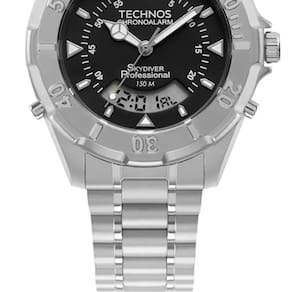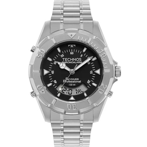Possui mecanismo Analógico/Digital, a pulseira é na cor Prata, fabricada em Aço, com 24 cm de comprimento e possui Fecho Dobrável com Trava. A Caixa peça onde fica o mostrador é fabricada em Aço com aro Rotativo, possui fundo do tipo Rosqueada, mede 4,0 cm de diâmetro, sem considerar a coroa, e 1,2 cm de espessura, o que é considerado tamanho Médio para relógios do gênero Masculino. O Relógio Technos Masculino Skydiver WT2050AE/1P tem nível de resistência à água especificado em 15 ATM. Com relação as funções adicionais do relógio: possui Calendário Digital, Cronômetro Digital, Um Alarme Diário, Aviso de Hora Cheia Função Chime e Marcadores com Illuminator. É Fabricado por Technos da Amazonia Indústria e Comércio. CNPJ: 04628426/0001-45 e tem de 1 Ano com o Fornecedor.