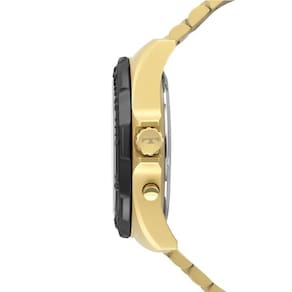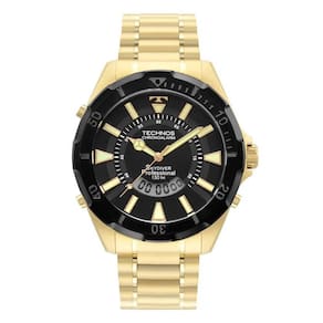 Relógio Technos Skydiver com caixa e pulseira de aço inoxidável em banho dourado. O modelo icônico da marca apresenta um maquinismo digiana exclusivo, aro giratório na cor preta e, no mostrador, detalhes em dourado com lumi. Possui tamanho de caixa 48mm e resistência à água de até 15 ATM. Apresenta funcionalidades de alarme, crono e 12/24.