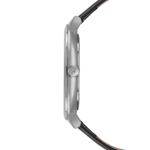 O mostrador azul-marinho com marcadores prateados traz um visual moderno e discreto. Sua pulseira em couro preto garante conforto no uso diário, enquanto o vidro de safira oferece resistência superior a riscos. O modelo ainda conta com calendário e resistência à água de 50 metros.