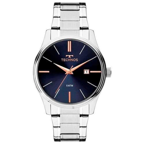 Relógio Technos masculino em banho prata com caixa de 4,3 cm de diâmetro, mostrador azul com marcadores branco, ponteiros rosê e função calendário.Um ótima escolha pata o dia a dia.