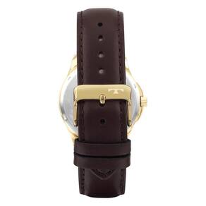 Vidro: Cristal Mineral Material da caixa: Aço Cor da caixa: Dourado Material da pulseira: Couro Cor da pulseira: marrom Diâmetro da caixa: 4,0 cm Mecanismo: Quartz Funções: Analógico / Calendário Resistência à água 5 atm