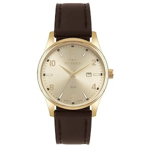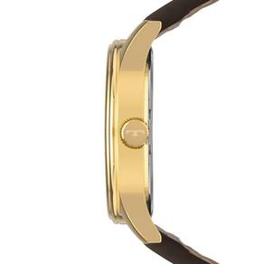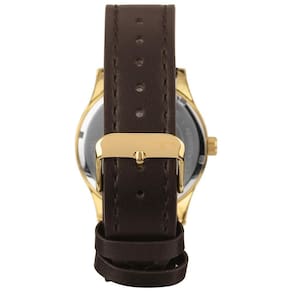 A pulseira em couro marrom complementa o visual com elegância e conforto, proporcionando um ajuste firme e agradável no pulso. A combinação entre o dourado da caixa e o couro cria um contraste clássico, muito valorizado no estilo masculino.