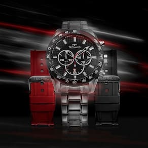 plaintext_description_meli - Relógio Technos Masculino Ts Carbon Grafite - JS25BBS/T1AReleitura de um modelo icônico da linha Carbon, agora na versão troca-pulseira. Além da pulseira de aço em 3 links, ele vem com duas pulseiras extras de silicone. É um relógio de design esportivo, inspirado no universo automobilístico. Seu mostrador é rico em detalhes, construído em duas camadas, com efeito de profundidade e aplicação de fibra de carbono. Produto 100% em aço inoxidável, com máquina quartz japonesa Miyota, calendário, cronógrafo e resistência à água de 100 metros. O conjunto acompanha um estojo especial, contendo o relógio, as duas pulseiras extras e uma ferramenta para realizar a troca.
