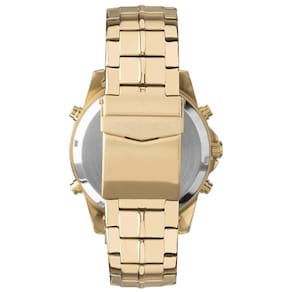 Relógio Technos DigiTech, apresenta caixa robusta e aro externo trabalhado com relevos. Ele possui um design moderno, unindo os maquinismos analógico e digital em um só relógio. Seu mostrador na cor preto, rico em detalhes, conta com números grandes nas posições de 5/15/25/35/45/55 minutos. Pulseira de aço 100% inoxidável em 3 links, banhado em dourado, com máquina anadigi, lente abaulada, marcações de fácil leitura e resistência à água de 100 metros.