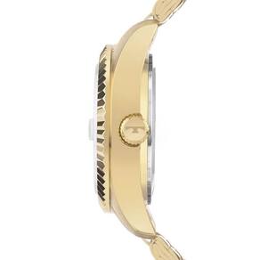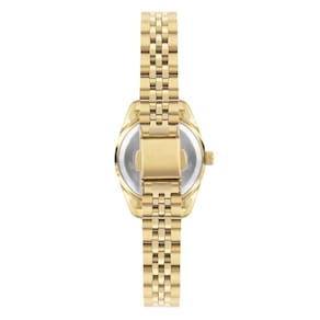 Relógio Technos Riviera feminino com caixa e pulseira de aço em banho dourado. Enaltecendo a essência dos clássicos, o modelo possui o icônico aro externo corrugado e vidro com lupa de calendário, ambos elementos tradicionais do universo relojoeiro. Além da pulseira diferenciada 5 links, ele apresenta mostrador de cor champanhe, que conta com a aplicação de pedras nos marcadores de hora. Produto 100% em aço inoxidável, com máquina quartz japonesa, calendário e resistência à água de 50m