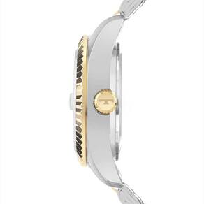 Relógio Technos Riviera feminino com caixa e pulseira de aço em banho bicolor prata com dourado. Enaltecendo a essência dos clássicos, o modelo possui o icônico aro externo corrugado e vidro com lupa de calendário, ambos elementos tradicionais do universo relojoeiro. Além da pulseira diferenciada 5 links, ele apresenta mostrador de cor champanhe, que conta com a aplicação de pedras nos marcadores de hora. Produto 100% em aço inoxidável, com máquina quartz japonesa, calendário e resistência à água de 50m.