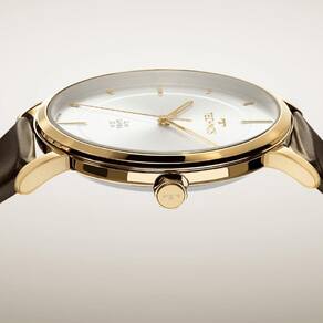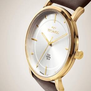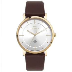 Relógio Technos Slim lança seu modelo, com caixa ultrafina, trazendo o sofisticado design minimalista, e lente de safira, altamente resistente a riscos e arranhões. Seu mostrador minimalista na cor prata apresenta assinatura de linha. Produto 100% em aço inoxidável, banhado em dourado, com pulseira de couro na cor marrom e resistência à água de 50 metros.