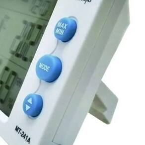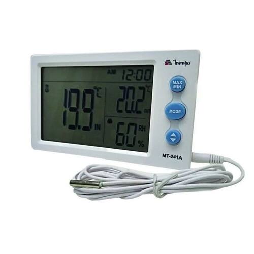 - O termo-higrômetro digital modelo MT-241A foi projetado para monitoramento de temperatura e umidade ambiente. - Possui sensor interno e externo, função de leitura máxima e mínima, unidade de medida (°C) e relógio integrado.