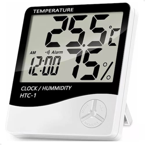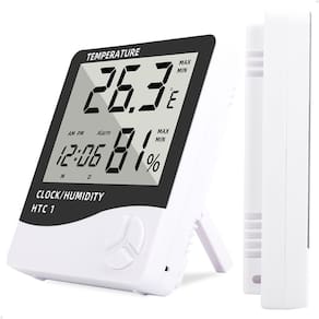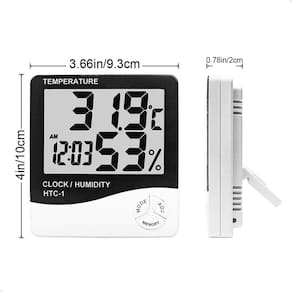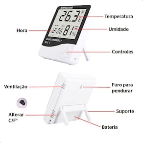 O termômetro digital exibe a temperatura em graus Celsius ou Fahrenheit, permitindo o monitoramento e ajuste conforme suas preferências. O higrômetro complementa, medindo a umidade relativa do ar no ambiente, crucial para controlar a umidade em quartos, salas de estar, escritórios, entre outros, impactando conforto, saúde e preservação de materiais.