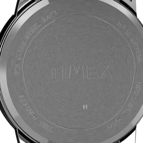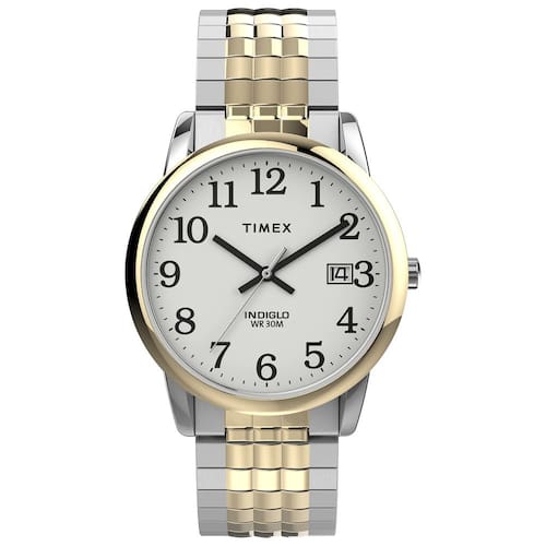 Relógio masculino Timex Easy Reader de 35 mm Perfect Fit — Estojo bicolor, mostrador branco com faixa de expansão bicolor — Pulseira de expansão de aço inoxidável bicolor de 20 mm, ajustável e perfeita para circunferência de pulso de até 8 polegadas — Mostrador branco de fácil leitura com algarismos arábicos pretos completos; janela de data às 3 horas — Caixa bicolor de latão de 35 mm com cristal de vidro mineral — Mostrador iluminado Indiglo — Resistente à água até 30 m (100 pés): em geral, resiste a respingos ou breve imersão na água, mas não é adequado para nadar ou tomar banho