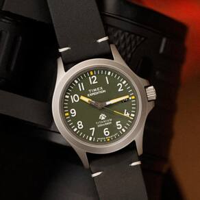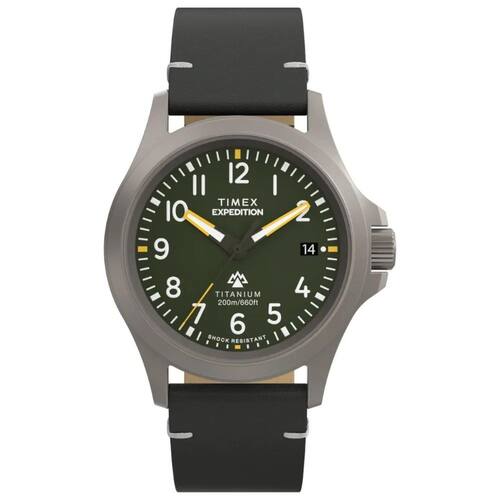 Relógio Timex Expedition North Titanium TW2W78100 Relógio Expedition North Titanium com caixa em titânio, resistente a choques, é leve e confortável no pulso, reforçada por um protetor de coroa robusto. Possui resistência à água de 200 metros, garantida pela coroa rosqueada e pelo fundo de caixa aparafusado, que impedem a entrada de água mesmo em condições extremas. O mostrador medindo 3,8 cm de diâmetro, conta com ponteiros e marcadores luminescentes para melhor visibilidade em ambientes de pouca luz, além de um calendário de data posicionada às 3 horas para praticidade no dia a dia. O movimento de quartzo é protegido por um cristal de safira, que assegura maior clareza e resistência a riscos. A pulseira de couro italiano, oferece maciez, flexibilidade e um compromisso com a sustentabilidade, complementada por costuras laterais contrastantes que reforçam seu visual moderno. Especificações Técnicas Mecanismo: Quartzo bateria Gênero: Masculino Visor: Verde Vidro: cristal mineral Funções: calendário, ponteiros fosforescentes. Prova d'água: 50m Características: caixa em titânio e pulseira em couro natural Diâmetro da caixa: 38 mm Largura da Pulseira: 20 mm : 1 ano pelo fabricante Timex