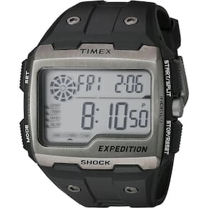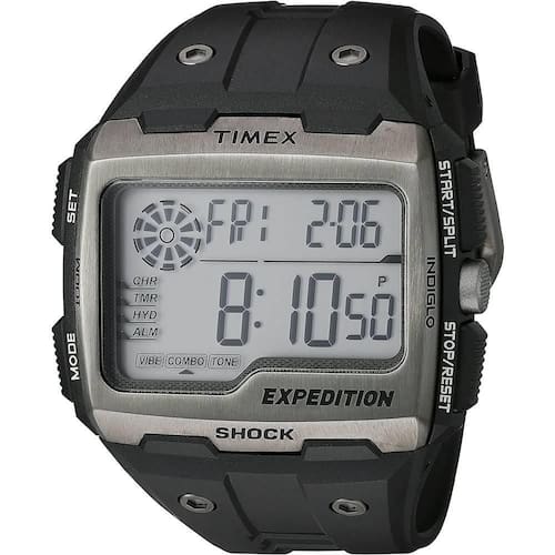 Funções: Digital, Iluminação Indiglo Night Light , 3 Fusos Horários, Calendário, Cronógrafo de 100 Horas, 3 Alarmes Com função vibratória , Timer, Sinal Horário Opcional, Lembretes, Timer de Hidratação Resistência à Água: 100m Diâmetro da Caixa: 50 mm x 38 mm Características: com caixa em Resina Preta e pulseira em Poliuretano Preta Vidro: acrílico Fundo Parafusado Alimentação do maquinário: Bateria Mostrador Preto com detalhes em verde Linha: Timex Expedition