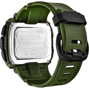 Funções: Digital, Iluminação Indiglo Night Light , 3 Fusos Horários, Calendário, Cronógrafo de 100 Horas, 3 Alarmes Com função vibratória e função soneca de 5 minutos , Timer de 24h, Sinal Horário Opcional Resistência à Água: 100m Diâmetro da Caixa: 54 mm x 45 mm Características: com caixa em Resina Verde e pulseira em Poliuretano Macia Verde Vidro: acrílico Fundo Parafusado Alimentação do maquinário: Bateria Mostrador Preto com detalhes em verde Linha: Timex Shock Resistant