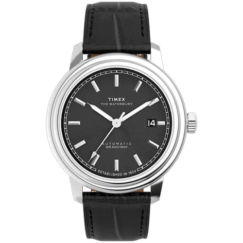 Relógio Timex Waterbury Metropolitan Automático TW2Y23000 Com design sofisticado, o Waterbury Automatic traz caixa de 41 mm em aço inoxidável com aro de dois níveis, mostrador preto com marcadores chanfrados, ponteiros elegantes e data às 3h. Completa o visual uma pulseira de couro preto com textura de crocodilo, de origem ética certificada pelo Leather Working Group LWG , e fecho dobrável. Especificações Técnicas Mecanismo: Automático Máquina Miyota com reserva de marcha de 40h. Gênero: Masculino Visor: Preto Vidro: cristal mineral Funções: case back transparente com máquina aparente, tampa rosqueada. Prova d'água: 50m Características: caixa em aço inoxidável, pulseira em couro natural com textura crocodilo, Diâmetro da caixa: 41 mm Largura da Pulseira: 20 mm : 1 ano pelo fabricante Timex Marca: Não Informado