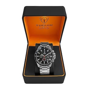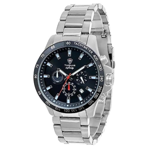 Funções: Analógico, Cronógrafo, Calendário Resistência à Água: 50m Diâmetro da Caixa: 45 mm Características: com caixa em Aço e pulseira em Aço Vidro: Cristal Mineral Fundo Rosqueado Alimentação do maquinário: Bateria Mostrador Preto Aro Preto Fixo Linha: Tuguir Infinity