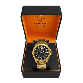 Funções: Analógico Resistência à Água: 50m Diâmetro da Caixa: 43 mm Características: com caixa em Aço e pulseira em Aço Vidro: Cristal Mineral Fundo Rosqueado Alimentação do maquinário: Bateria Mostrador Dourado Com Todos os Números e Detalhe em Vermelho Linha: Tuguir Infinity