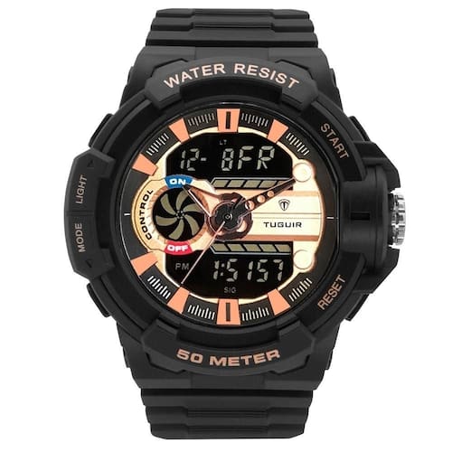 Características: com caixa em Policarbonato Preta e pulseira em Poliuretano Preta