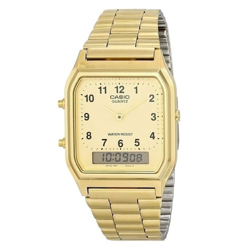 o relógio é um dos acessórios mais presentes em todas as fases da nossa vida, mesmo com inúmeros dispositivos modernos que mostram as horas, o clássico relógio para pulso não perdeu seu charme e é uma ótima opção para complementar o visual. O relógio unissex casio vintage aq-230ga-9bmq é perfeito para uso pessoal ou para presentear alguém especial em uma data comemorativa, sendo um presente único, de ótimo gosto, elegância e muita praticidade. Produzido com materiais resistentes e de qualidade, a peça reúne sofisticação e estilo em um único item. A escolha perfeita para quem gosta de ter um acessório que complemente o look em qualquer ocasião. Características: marca: casio fabricante: casio referência: aq-230ga-9bmq genêro: unissex mecanismo: digital/analógico quartzo alimentação: bateria composição do vidro: acrílico material da caixa: resina