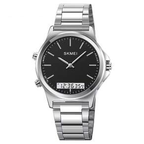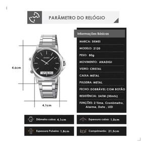 Marca: skmei Categoria: ana-digi Analógico: sim 1 horário Ponteiros fluorescentes: não Digital: sim 1 horário Calendário: sim Despertador: sim Mostra o dia da semana: sim Mostra o dia do mês: sim Cronômetro: sim Contador regressivo: não Luz: sim Cor da iluminação: verde Resistente à água: 3 atm resiste a imersões breves Respingos: sim Chuva: sim Lavar carro: sim Lavar louça: sim Natação: não Mergulho: não Característica do vidro: cristal mineral Tipo de fecho: dobrável com botão Cor da caixa: prata Material da caixa: metal banho ip Formato da caixa: redondo Diâmetro da caixa: 38,00 mm Espessura da caixa: 10,00 mm Cor da pulseira: prata Material da pulseira: metal Largura da pulseira: 18,00 mm Comprimento máximo da pulseira: 215,00 mm Alimentação: bateria interna Peso líquido: 0,080 kg Modelo: 2120 Cor predominante: prata : 12 meses O que vem na caixa: 01 relógio 01 embalagem 01 termo de Marca: Não Informado