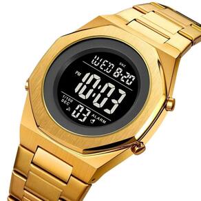 Relógio Unissex Skmei Digital 2066 Dourado Relógio Unissex Skmei Digital 2066 Dourado Marca: Skmei Categoria: Digital Analógico: Não Digital: Sim 1 Horário Calendário: Sim Despertador: Sim Mostra o Dia da Semana: Sim Mostra o Dia do Mês: Sim Cronômetro: Sim Contador Regressivo: Sim Luz: Sim Cor da Iluminação: Verde Resistente à Água: 3 ATM Resiste a imersões breves - Respingos: Sim - Chuva: Sim - Lavar Carro: Sim - Lavar Louça: Sim - Natação: Não - Mergulho: Não Característica do Vidro: Cristal Mineral Tipo de Fecho: Dobrável com Botão Cor da Caixa: Dourado Material da Caixa: Metal Banho IP Formato da Caixa: Quadrado Comprimento da Caixa: 41,00 mm Largura da Caixa: 41,00 mm Espessura da Caixa: 10,00 mm Cor da Pulseira: Dourado Material da Pulseira: Aço Largura da Pulseira: 20,00 mm Comprimento Máximo da Pulseira: 280,00 mm Alimentação: Bateria Interna Peso Líquido: 0,140 Kg Modelo: 2066 Cor Predominante: Dourado : 12 Meses Conteúdo da Embalagem: 01 Relógio 01 Embalagem 01 Termo de Ean: 7891368320229