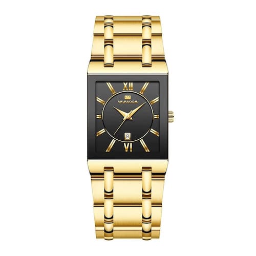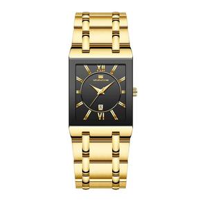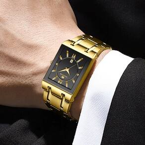 Essencial para qualquer pessoa com um senso de moda aguçado, este relógio conta com a combinação de cores preto e ouro que exala exclusividade. É ideal para eventos formais, reuniões de negócios ou mesmo para aprimorar seu look diário com um toque de refinamento. A caixa retangular do relógio oferece um visual contemporâneo e distinto, destacando-se entre os modelos convencionais.