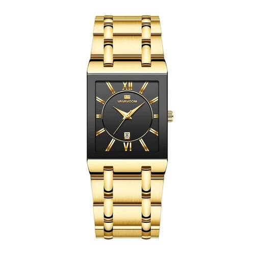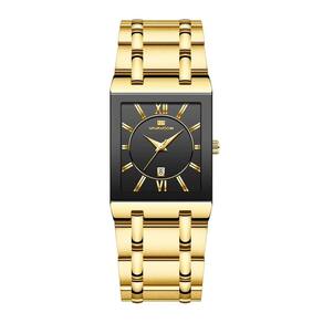 Essencial para qualquer pessoa com um senso de moda aguçado, este relógio conta com a combinação de cores preto e ouro que exala exclusividade. É ideal para eventos formais, reuniões de negócios ou mesmo para aprimorar seu look diário com um toque de refinamento. A caixa retangular do relógio oferece um visual contemporâneo e distinto, destacando-se entre os modelos convencionais.