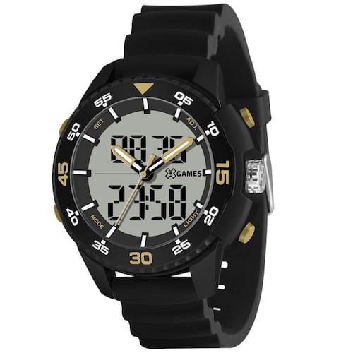 Relógio X Games Masculino Ref: Xmppa328 Bxpx Oversized Anadigi DESCRIÇÃO DO PRODUTO: Visor: LCD Funções: Anadigi, Calendário, Iluminação, Alarme, Timer, Cronógrafo, Dual Time Resistência à Água: 100m Diâmetro da Caixa: 51 mm Características: com caixa em Policarbonato e pulseira em Silicone Vidro: Acrílico Fundo Parafusado Alimentação do maquinário: Bateria Garantia de 1 Ano