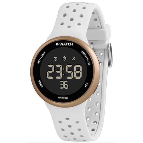 Características: com caixa em Resina Rosé e pulseira em Silicone Branca