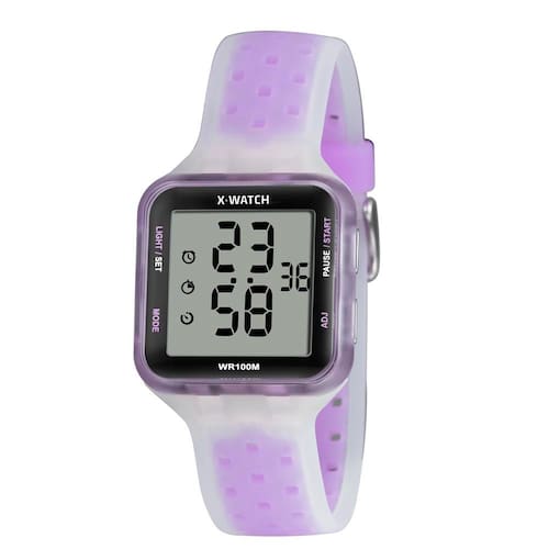 Características: com caixa em Resina lilás Translúcida e pulseira em Silicone Translúcido com detalhes em lilás translúcido