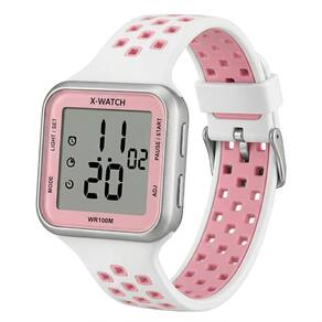 Características: com caixa em Resina Prateada e pulseira em Silicone branco com detalhes em rosa