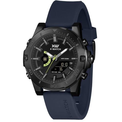 Relógio X-Watch Masculino Ref: Xmnsa008 P1dx Anadigi Black DESCRIÇÃO DO PRODUTO: Visor: LCD Funções: Anadigi, Calendário, Iluminação, Alarme, Cronógrafo Resistência à Água: 100m Diâmetro da Caixa: 48 mm Características: com caixa em Aço e pulseira em Silicone Azul Vidro: Cristal Mineral Fundo Rosqueado Alimentação do maquinário: Bateria Mostrador Preto com detalhes em grafite e verde Aro fixo preto de 1 Ano Marca: Não Informado