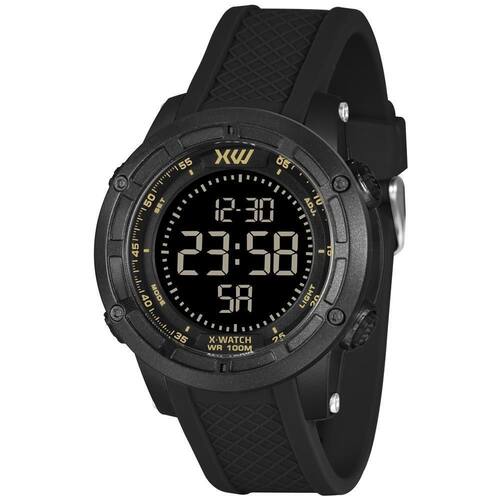Relógio X-Watch Masculino Ref: Xmppd711 Pxpx Esportivo Digital DESCRIÇÃO DO PRODUTO: Funções: Digital, Iluminação, Calendário, Cronógrafo, Alarme, Timer, Dual Time Resistência à Água: 100m Diâmetro da Caixa: 50 mm Características: com caixa em Resina Preta e pulseira em Silicone Preta Vidro: acrílico Fundo Parafusado Alimentação do maquinário: Bateria Mostrador Preto com detalhes em dourado de 1 Ano Marca: Não Informado