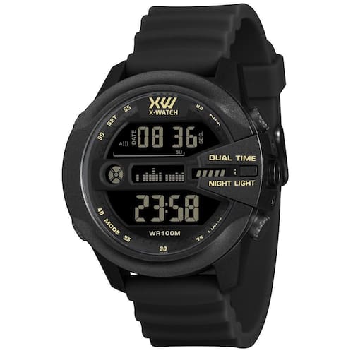 Relógio X-Watch Masculino Ref: Xmppd803 Pxpx Esportivo Digital DESCRIÇÃO DO PRODUTO: Funções: Digital, Iluminação, Calendário, Cronógrafo, Alarme, Timer, Dual Time Resistência à Água: 100m Diâmetro da Caixa: 48 mm Características: com caixa em Resina Preta e pulseira em Silicone Preta Vidro: acrílico Fundo Parafusado Alimentação do maquinário: Bateria Mostrador Preto com detalhes em dourado de 1 Ano Marca: Não Informado
