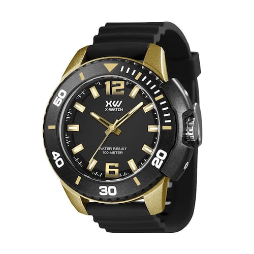 ESPECIFICAÇÕES DO RELÓGIO DE PULSO X-WATCH DIGITAL COM ALARME autêntico RESISTENTE À ÁGUA: MARCA: X-Watch MODELO: XMPP0032 P2PX/Masculino/Esportivo/Silicone/Analógico/Bonito GÊNERO: Masculino COR DA CAIXA: Preto com Dourado COR DO RELÓGIO: Preto com Dourado COR DO MOSTRADOR: Preto MATERIAL DA PULSEIRA: Silicone MATERIAL DA CAIXA: Resina MODELO DO FECHO: Fivela Simples TIPO DE MOVIMENTO: Bateria TIPO DE VIDRO: Cristal Mineral TAMANHO DA CAIXA: 50mm ESPESSURA: 19mm É RESISTENTE À ÁGUA? Sim É ADEQUADO PARA MERGULHO? Não PROFUNDIDADE RESISTÊNCIA À ÁGUA: 100 Metros Marca: Não Informado