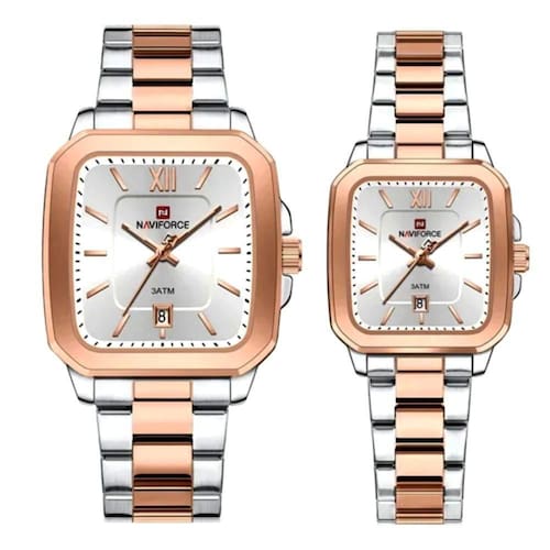 Este sofisticado conjunto de relógios de pulso analógicos é perfeito para casais que apreciam estilo, durabilidade e funcionalidade. Ambos os relógios, um para ele e outro para ela, apresentam um design moderno e elegante em aço inoxidável, garantindo resistência e sofisticação. O formato quadrado das caixas confere um toque contemporâneo e arrojado, ao mesmo tempo que proporciona conforto e praticidade no uso diário.