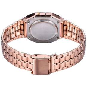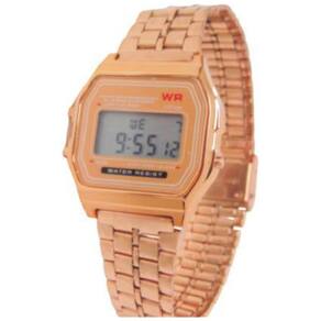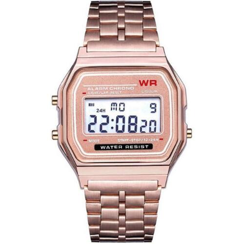 -cronômetro de 1/100 de segundo -alarme -iluminador em LED -pulseira de aço inoxidável - Design retrô popular -vidro com resina -material do corpo/garra: Resina / Dourado -pulseira de Aço Inoxidável -fecho ajustável