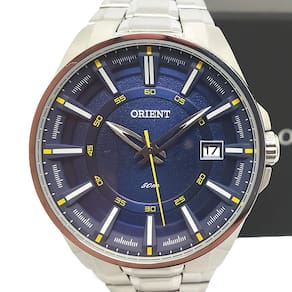 A orient relógios é uma marca que se consagra pela grande qualidade e beleza de suas peças. Toda a confiabilidade de um relógio japonês com anos de tradição no mercado nacional e internacional. Fundada em 1950, os relógios orient são peças únicas e distintas. Hoje, essa marca atende clientes em mais de 70 países. Relógio masculino orient mbss1313 dysx produto comprado diretamente com os representantes oficiais da marca no brasil. Especificações do modelo: - material da caixa: aço inoxidável; - material da pulseira: aço inoxidável; - resiste até 5 atm de pressão; - vidro em cristal mineral; - máquina: analógica à bateria; - à prova d'água; - partes brancas do ponteiro e marcações com efeito fosforescente emite luz por um tempo no escuro após receber luz de outra fonte . - peso: 160 gramas; fundo: rosca. Dimensões do modelo seguindo o esquema que está nas fotos do anúncio: - espessura caixa: 12 mm 1,2 cm ; - diâmetro caixa: 45 mm 4,5 cm ; - diâmetro visor: 42 mm 4,2 cm ; - comprimento vertical: 52 mm 5,2 cm ; - comprimento horizontal c/ coroa : 48 mm 4,8 cm ; - largura pulseira: 22 mm 2,2 cm ; - largura pulseira base: 27 mm 2,7 cm . O relógio orient acompanha: - estojo ; - garantia de 1 ano em todo o brasil com o fabricante orient; - manual em português; -. Obrigado pela preferência