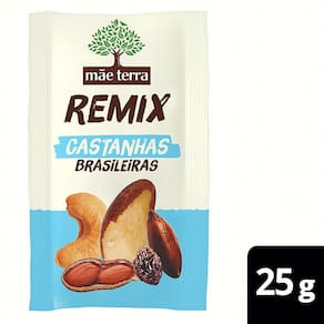 REMIX CASTANHAS BRASILEIRAS MÃE TERRA •O Remix de castanhas brasileiras é um mix saudável de bolso pra você levar para qualquer lugar. •Com 3 castanhas do nosso Brasil: da Amazônia, a castanha-do-pará Ean: 7896496972500