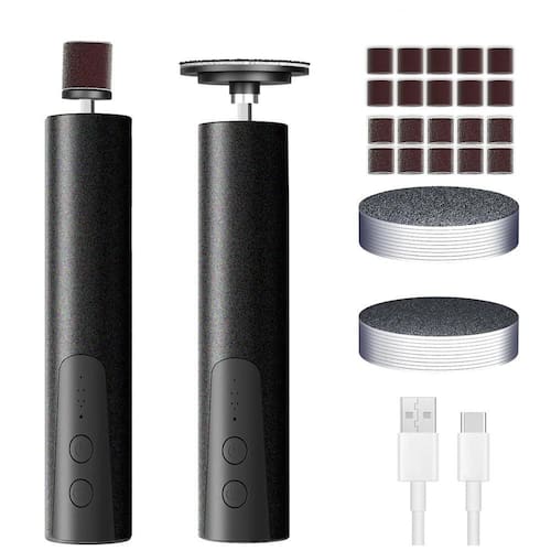 Removedor elétrico de calos sem fio para pés com lixadeira de lixa de unhas 2 em 1 Moedor de lixa de pé recarregável para pele morta, rachar calos secos com disco de lixa ajustável em 6 velocidades - REMOVEDOR ELÉTRICO DE CALOS DE PÉ ATUALIZADO E MOEDOR DE UNHAS 2 EM 1: Ótimo design que combina o uso de remoção elétrica de calos e lixa elétrica de unhas em um único dispositivo. Basta alternar entre as cabeças de trituração para alternar facilmente entre a lixagem das unhas e a remoção do calo do pé. A rotação de 360 graus remove suavemente a pele morta dos pés, deixando-os macios e suaves. Também pode ser utilizado para remover esmaltes de unhas naturais e artificiais. - DESIGN SEM FIO: Este removedor elétrico de calos é compacto, portátil e recarregável. Ele usa uma bateria de lítio de 1200mAh, permitindo 1,5 horas de uso. Ele também pode ser utilizado enquanto estiver conectado para uso contínuo. O design sem fio é recarregado via porta Type-C e tem um indicador de carregamento USB. Possui um forte torque e um motor potente, garantindo um uso irrestrito. - VELOCIDADE DE 6 MARCHAS: A velocidade deste dispositivo pode ser ajustada de 630 rpm a 1000 rpm usando o controlador. Isso permite um ajuste conveniente das velocidades para remover a pele morta e dura dos pés. Observe que esta lixa elétrica para pés é adequada apenas para peles mortas comuns e não para calos grossos e graves. CUIDADO: Ao usar a máquina, aplique a quantidade adequada de força para garantir a rotação adequada do removedor elétrico de calos do pé. - MÉTODO DE OPERAÇÃO: A operação desta lima elétrica para pés é simples. Comece lavando os pés com água morna e encharcando-os completamente. Escolha a cabeça de moagem e a velocidade adequadas para cuidar dos pés. Por fim, aplique o creme para os pés para manter a pele macia. Ao substituir o disco abrasivo, remova a camada de papel adesivo na parte traseira da folha, alinhe o centro do disco do triturador de pés e cole-o com firmeza. - A embalagem inclui: 1 removedor elétrico de calos para pés, 20 discos de lixa (10 unidades 80 Grit e 10 unidades 120 Grit), 1 cabo de carregamento tipo C e lixa de 10 anéis para o moedor de unhas. Este conjunto é eficiente, ajustável e fácil de usar. É uma ferramenta perfeita para quem quer manter os pés macios e sem calos. Também pode servir como um presente atencioso para amigos, familiares e entes queridos.