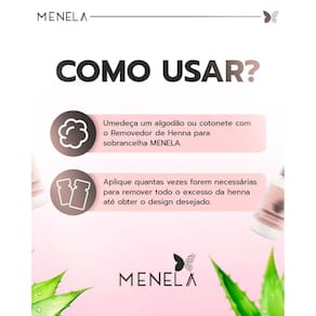 Como remover henna da sobrancelha com nosso removedor 1º Umedeça o algodão ou cotonete com o Removedor de Henna para sobrancelha MENELA. 2º Aplique quantas vezes forem necessárias para remover todo o excesso da henna na sobrancelha até obter o melhor design ou a remoção desejada.