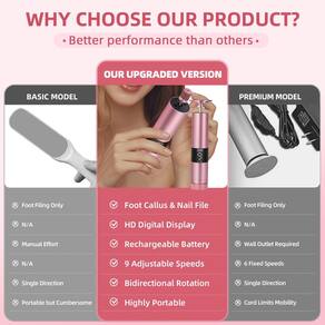 - Cabeças duplas 2 em 1, removedor de calos de nível profissional: alterne facilmente entre uma lixa elétrica e uma furadeira de pregos com o design de cabeça dupla. Perfeito para remoção de calos, modelagem de unhas, polimento de esmalte e pele seca e morta. Cuide de todos os cuidados com os pés e unhas com uma ferramenta versátil.