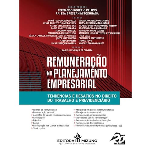 Esta obra coletiva visa suprir uma demanda por estudos atuais acerca da remuneração no planejamento empresarial. Diante das novas tendências do mercado, buscou-se enfrentar questões sobre modernas formas para atrair e/ou reter talentos nas empresas.  Trata-se de uma coletânea de artigos escritos por professores do LL.M. em Direito do Trabalho do INSPER, profissionais altamente especializados, não só em Direito do Trabalho, mas também em Direito Previdenciário, incluindo advogados empresariais e magistrados com anos de atuação prática. Além disso, os professores também orientaram alunos da primeira turma dessa pós-graduação, que contribuíram com seus estudos, construindo uma obra repleta de aspectos modernos da remuneração.  Tudo isso sob a coordenação dos docentes-líderes do Curso, Fernando Rogério Peluso e Raissa Bressanim Tokunaga, que cuidadosamente reuniram conteúdo totalmente alinhado com as expectativas empresariais.  Os interessados pelo tema vão se deparar com abordagens inéditas acerca de aspectos remuneratórios, desde os conceitos de prêmio e equiparação salarial até o enfrentamento de novas questões, tais como a remuneração dos nômades digitais, earn-out em operações de acqui-hiring, o metaverso para fins remuneratórios, expatriados, a justa remuneração no direito de invenção, remuneração do atleta profissional, os impactos trabalhistas do salário emocional e o skill-based-pay no direito brasileiro.  Não poderiam ficar à margem temas que circundam a remuneração variável, envolvendo bônus de contratação e de retenção, participação nos lucros e resultados, planos de stock options, indicadores ESG nas metas, remuneração de executivos, pagamento por criptomoedas e até mesmo pagamentos variáveis a empregados de organizações da sociedade civil imunes.  Certamente este é um livro de leitura e consulta indispensáveis aos operadores do Direito que buscam se atualizar nos aspectos práticos mais modernos da remuneração nas empresas.