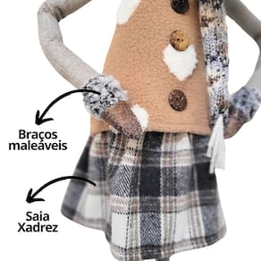 -01 unidade Boneco Rena Decorativa Menina Cinza e Marrom Rústico, saia xadrez e cachecol em crochê 60cm
