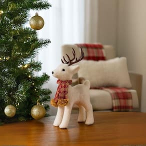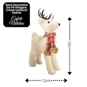 Complete sua decoração de Natal com a Rena Decorativa em Pelúcia Creme, modelo em pé com cachecol xadrez vermelho e marrom. Um enfeite elegante e acolhedor que traz o espírito natalino para qualquer ambiente.