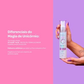 01. Borrife o Magia de Unicórnio Forever Liss Preparador Capilar Bifásico na palma das mãos em cabelo secos ou úmidos.