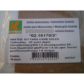 O kit é composto de todas as juntas necessárias para um serviço de desmontagem, limpeza e montagem do carburador (todos os componentes que aparecem nas fotos); Acompanha válvula de máxima; NÃO acompanha giclês; NÃO acompanha agulha; NÃO acompanha boia; NÃO se aplica ao carburador 2E CE (Eletrônico); NÃO se aplica a outros carburadores.