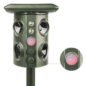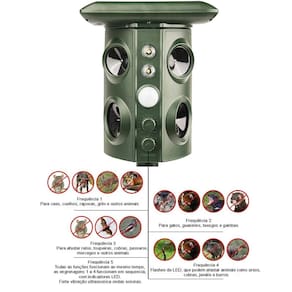 Utilizando o som de ondas ultra-sônicas e a tecnologia de detecção de infravermelho, o repelente pode manter gatos, pássaros e outros pequenos animais dispersos longe do jardim ou quintal com eficiência. Com Luzes fortes para espantar todo tipo de animais.