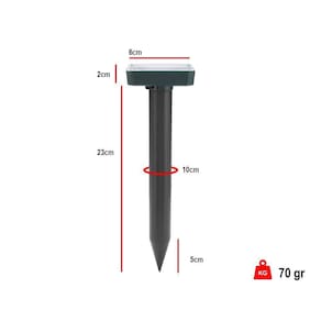 O Repelente solar é projetado para repelir possiveis pestes de aproximar da area desejada, tais como cobras, topeiras, ratos e roedores, utilizando ondas ultrassônicas em conjunto de vibrações. Para melhor desempenho do produto não os posicione um ao lado do outro. Mantenha uma distancia de até 30 metros. Apenas utilizar em lugares onde o sol consiga atingir o Repelente Solar para que o mesmo possa fazer a recarga de bateria durante o dia. Características Energia Solar / Sem Consumo de Eletricidade. Não emite substancias tóxicas Ultrassônico e vibrações. Bateria de: 600 MaH Painel: 4v Material: ABS Frequencia: 400hz-1000z (sinal escalonavel para manter a efetividade do produto) Resistente a agua. Dimensões Aproximadas: Altura: 25cm Largura do painel solar: 4cm Circunferência da base: 10cm 3 meses de garantia contra defeito de fabricação **150gr Modelo: Repelente Caixa Branca 2 unidades