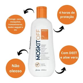 O Repelente de Insetos Moskitoff é uma loção desenvolvida para oferecer proteção eficaz contra picadas de mosquitos, incluindo os transmissores de doenças como dengue, zika, chikungunya e febre amarela. Sua fórmula contém DEET, um dos repelentes mais eficazes disponíveis, garantindo até 4 horas de proteção.